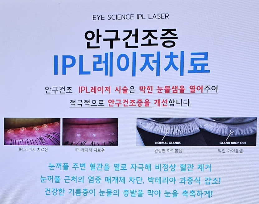 IPL(Intense Pulsed Light) 레이저 치료는 안구건조증, 특히 마이봄샘 기능 장애(MGD)의 근본적인 치료에 매우 효과적입니다.